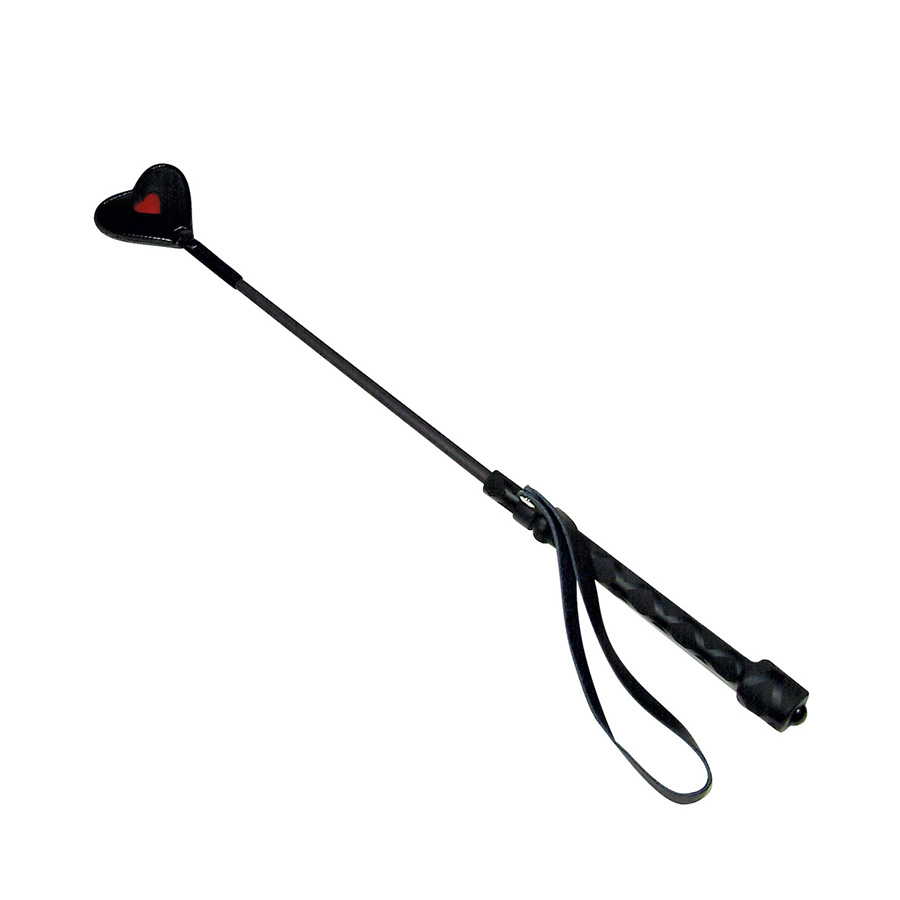Črno-rdeči bič znamke Bad Kitty z nastavkom v obliki srca, plastično palico in ročajem z zanko za obešanje. Dolžina približno 45 cm.